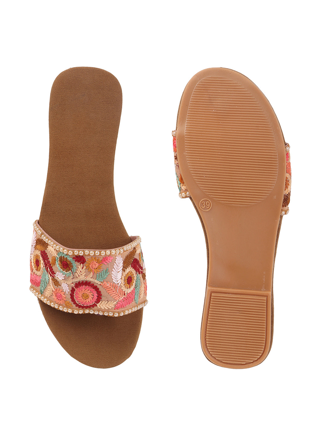 Add a touch of traditional charm to your everyday style with these embroidered flat sandals. Featuring delicate floral threadwork on a soft strap and a comfortable toe-ring design, they are perfect for effortless ethnic and fusion looks.