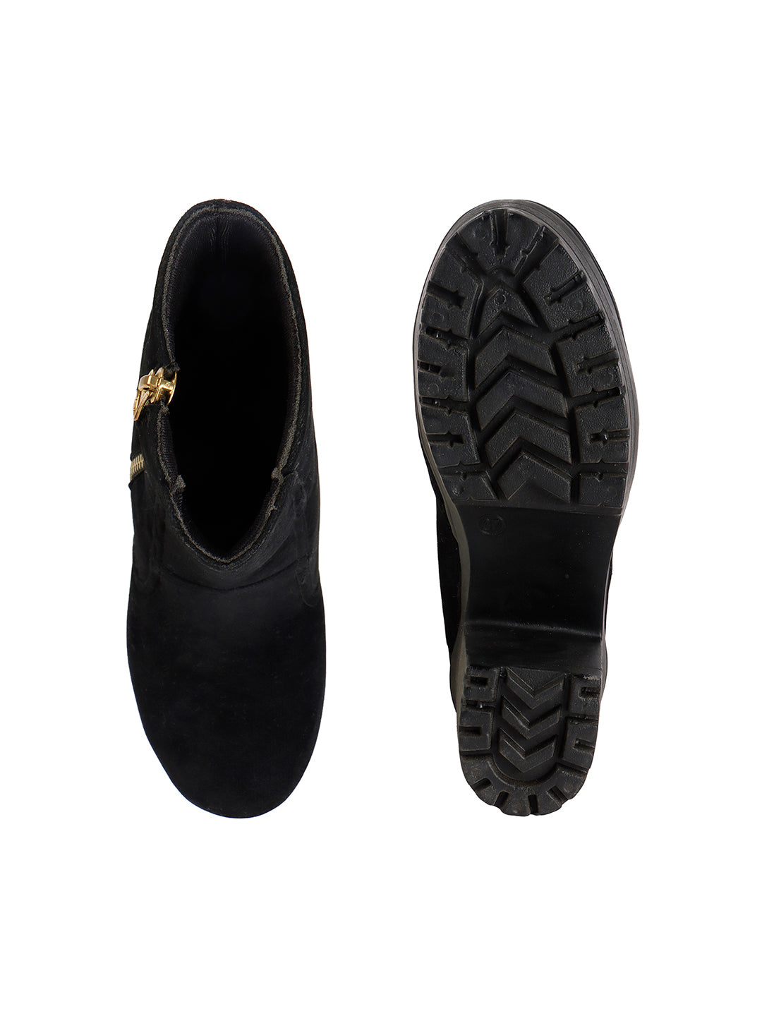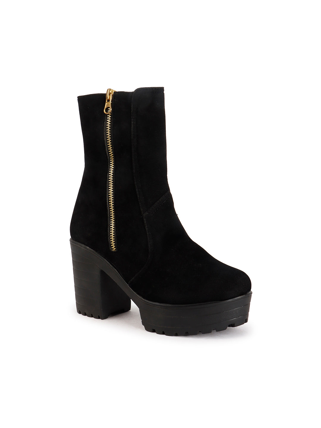 Stylish black suede-finish ankle boots featuring a front zip closure, platform sole, and a stable block heel for a bold yet comfortable look. Designed for easy wear and everyday comfort, these boots are perfect for party styling, evening outings, and winter wear.