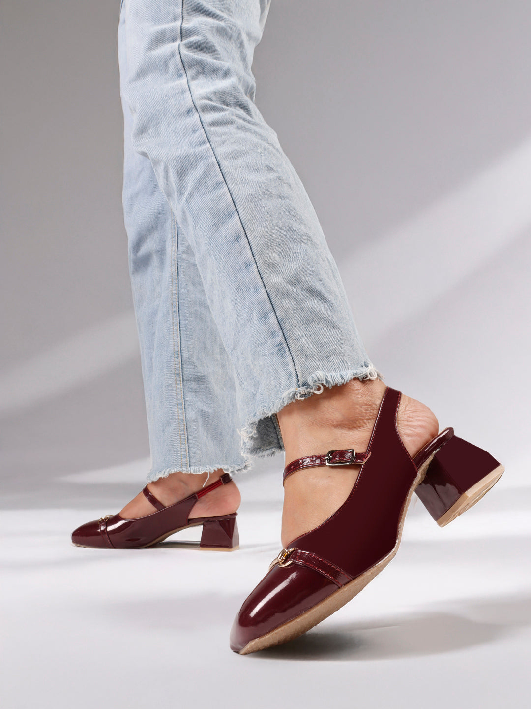 Design: Mary Jane silhouette with metallic buckle detail