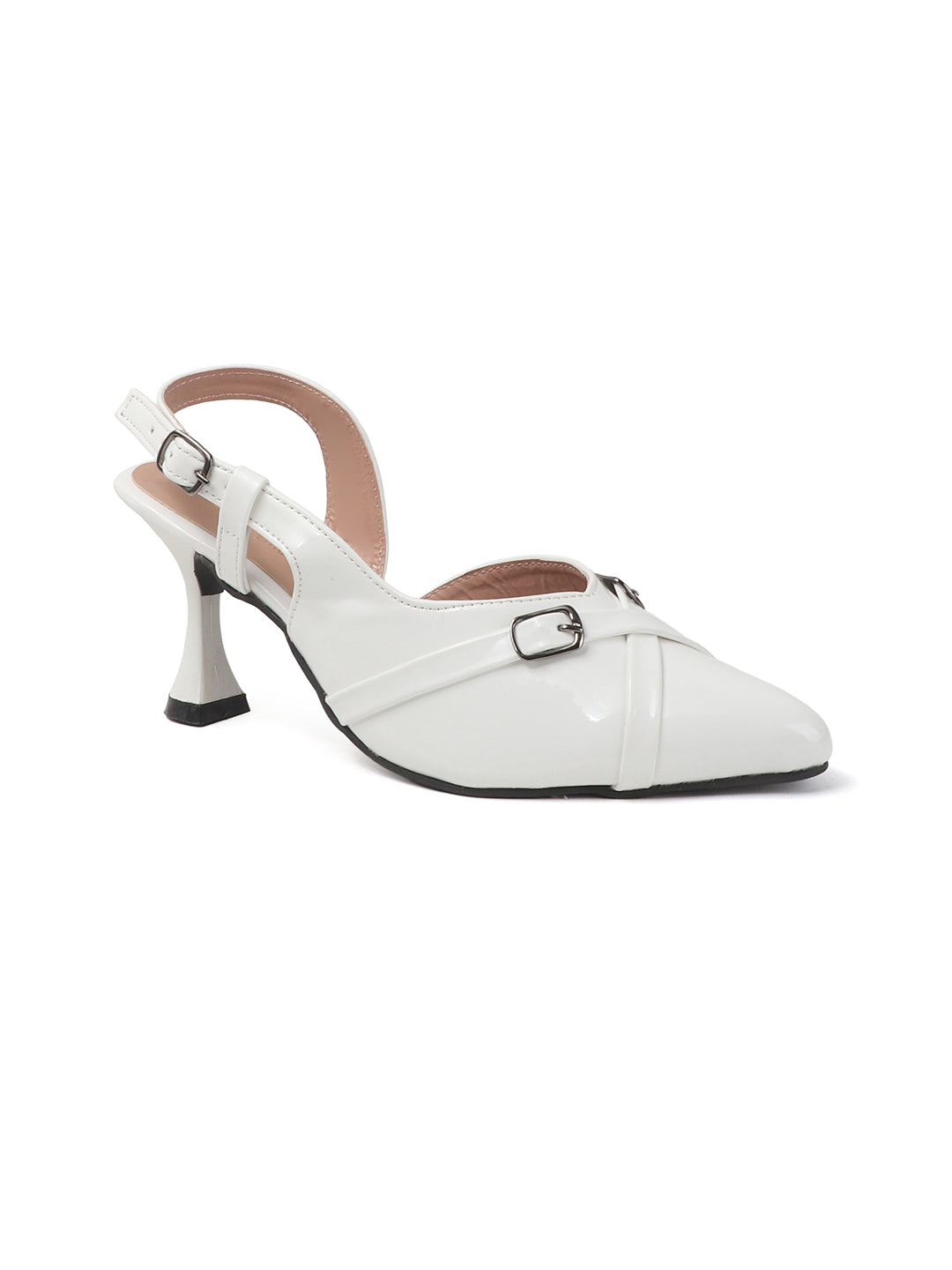 Elevate your everyday elegance with these patent-finish slingback heels featuring refined double buckle detailing. Designed with a sharp pointed toe and a comfortable mid heel, this pair offers a perfect blend of sophistication and modern style.