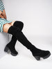 Stylish black knee-high boots with a stretch-fit suede finish upper for a sleek and comfortable fit. Designed with a chunky block heel and anti-skid lug sole, these boots offer stability, grip, and everyday comfort. Perfect for winter wear, casual outings, and party looks.