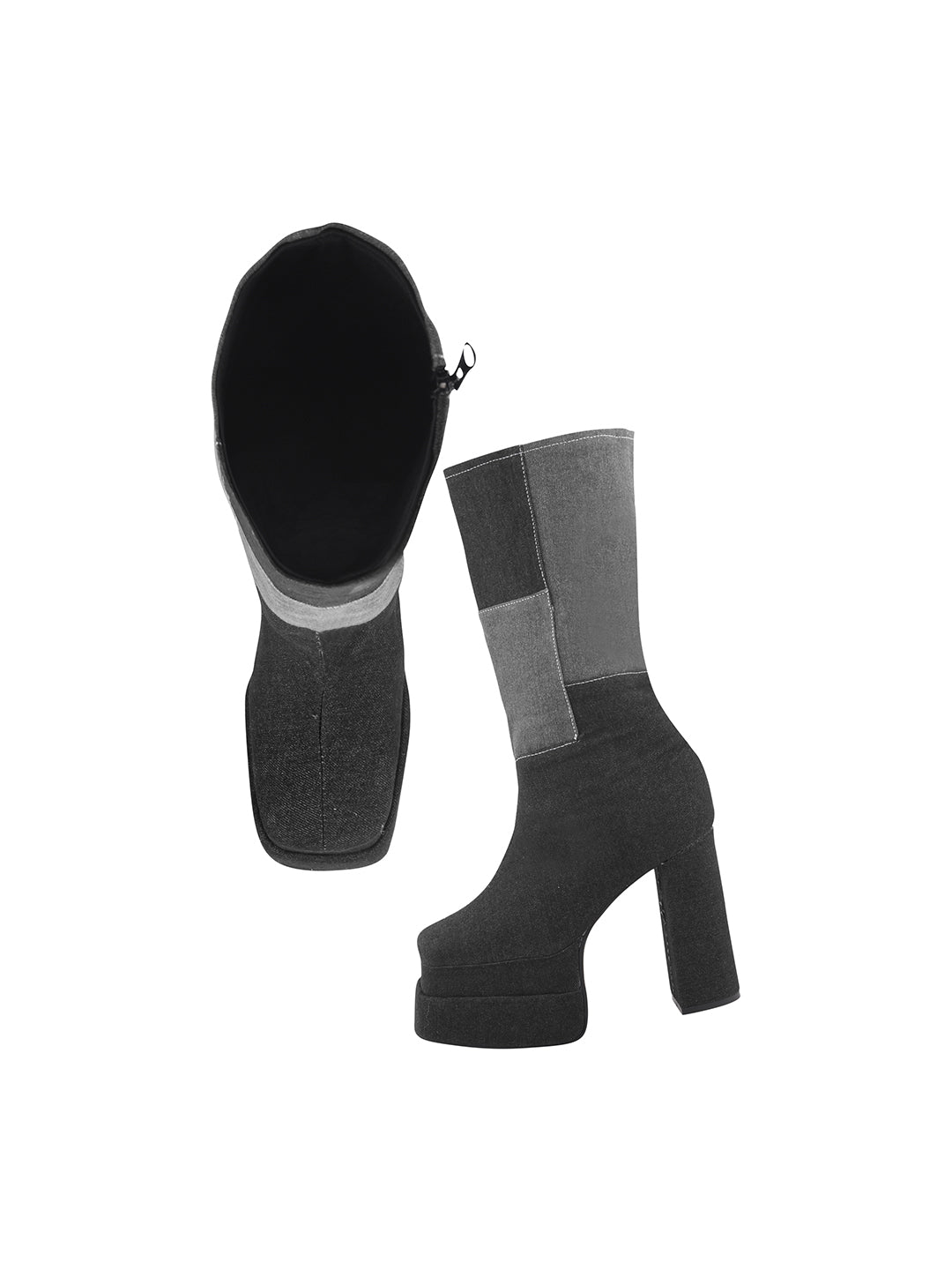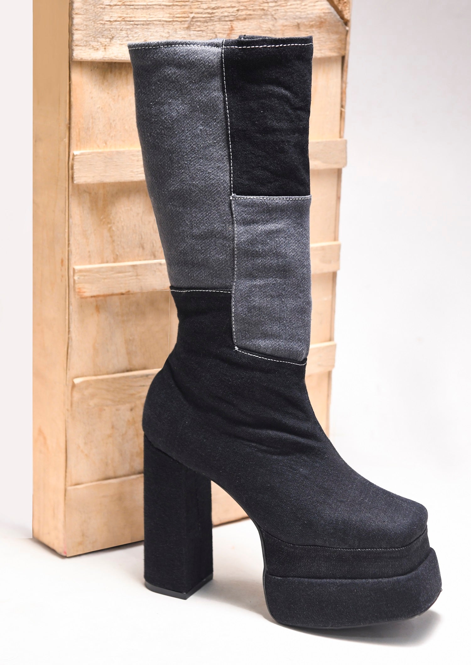 TRYME Women's Colourblock Denim Below Knee Length Block Heeled Boots
